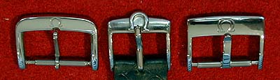 OMEGA-signed buckles: [left] from modern OMEGA dress strap, [center] vintage, [right] from modern OMEGA sport strap
