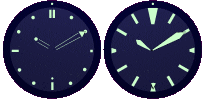 Black dial with luminous hour markers and radium luminous hands of "Broad arrow," "Dauphine" or "Stick" type. |