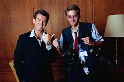 Pierce Brosnan (left) wearing a Seamaster GMT, presenting the James Bond Seamaster